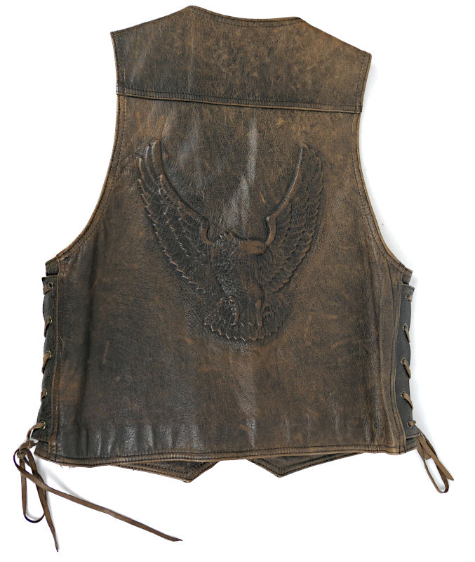 Kožená motorkářská vesta v hnědé barvě se šnerováním na bocích